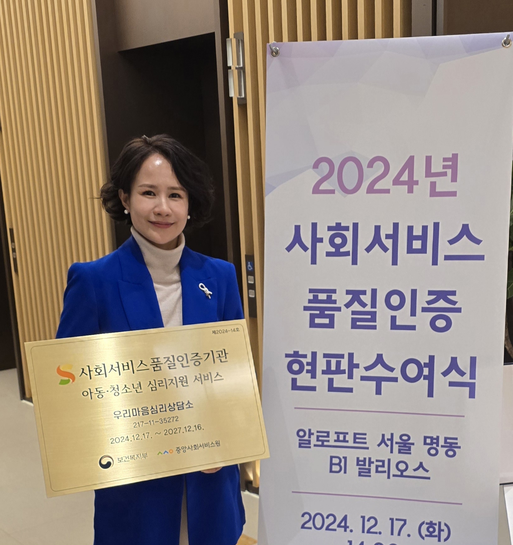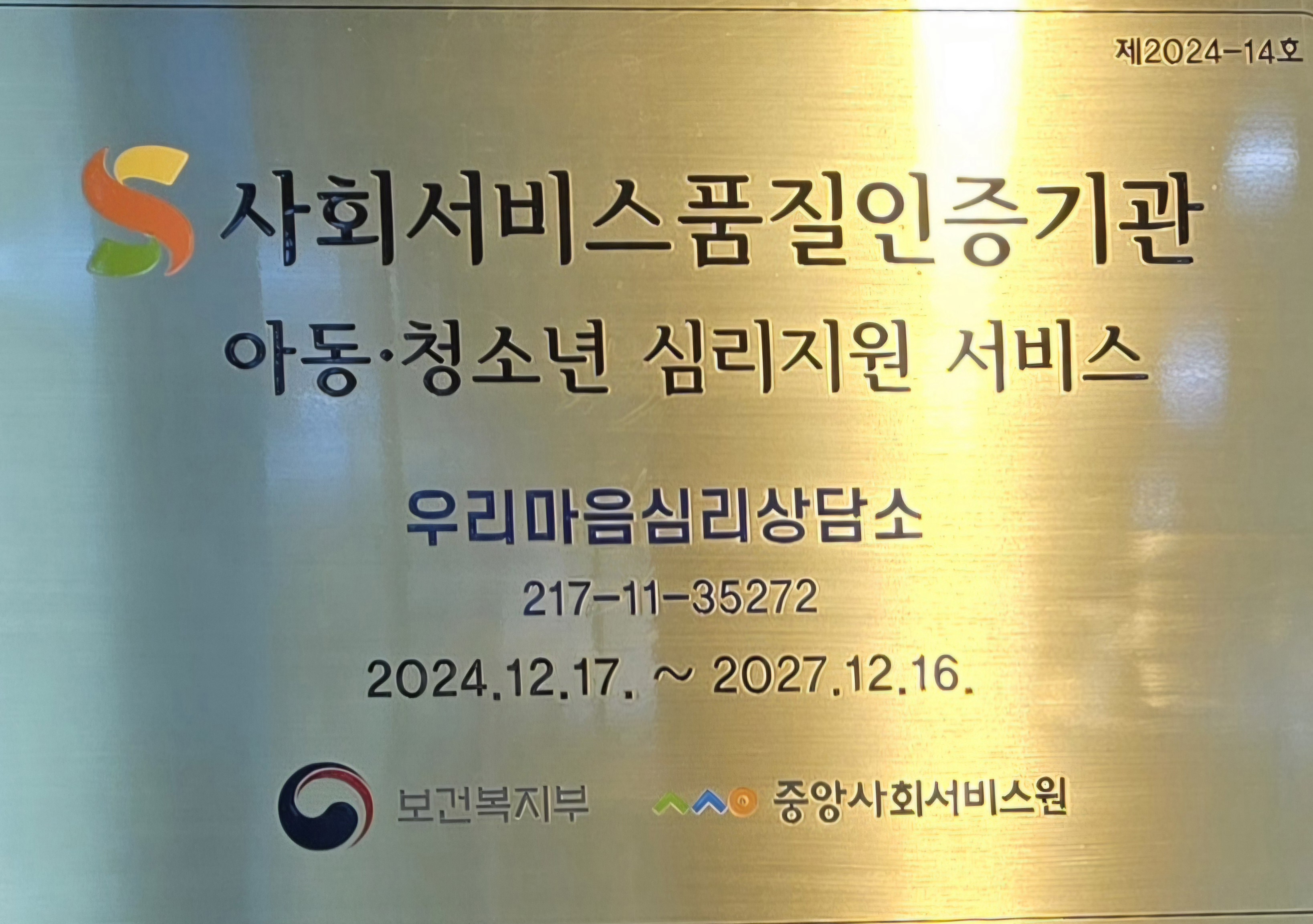 우리마음심리상담소가 2024년 보건복지부와 중앙사회서비스원에서 시행한 품질인증기관으로 선정되었습니다.