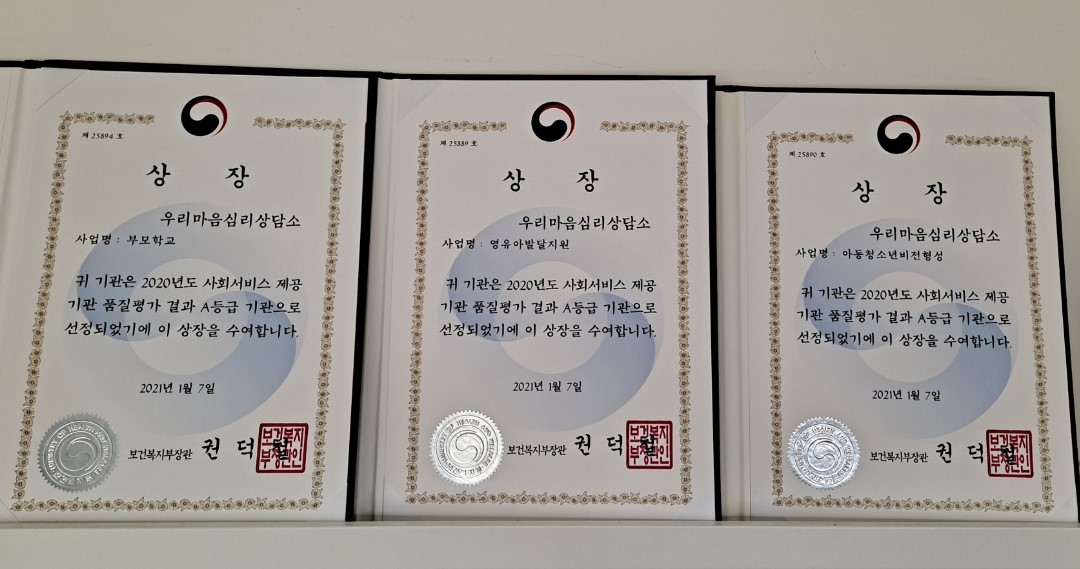 또한 우리마음심리상담소는 보건복지부에서 검증한 전국 최고 수준의 치료 서비스 기관으로 20년도에 인정받았으며, 디딤 정신건강의학과, 선정신건강의학의원과도 의료 협력을 맺은 기관입니다.